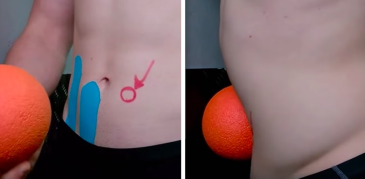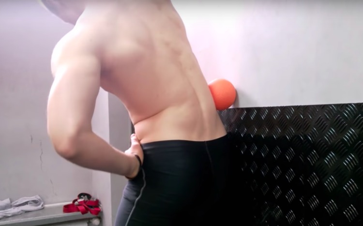 2. Piłkę umieść na wysokości pępka w tylno-bocznej część tułowia (nie celuj w kręgosłup lędźwiowy!).