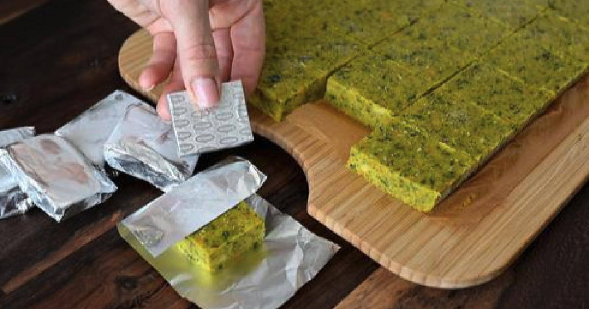 Bulion pokroić w kostkę i zawinąć w folię. Następnie włóż kostki do zamykanej plastikowej torby. Możemy przechowywać w zamrażarce.