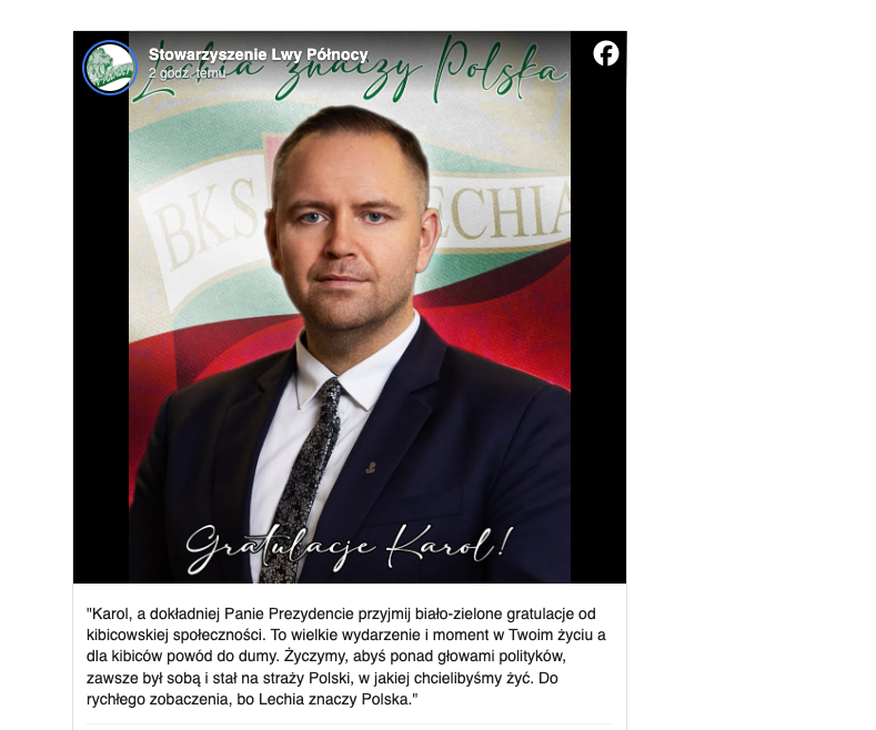„Karol, a dokładniej Panie Prezydencie przyjmij biało-zielone gratulacje od kibicowskiej społeczności. To wielkie wydarzenie i moment w Twoim życiu, a dla kibiców powód do dumy. Życzymy, abyś ponad głowami polityków zawsze był sobą i stał na straży Polski, w jakiej chcielibyśmy żyć. Do rychłego zobaczenia, bo Lechia znaczy Polska.”