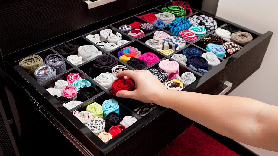Najlepszy sposób na zaoszczędzenie miejsca w szafie i szufladach jest zwinięcie ich. Unikniesz wtedy ich wymięcia oraz nie będziesz miał tyle problemu z ich odnalezieniem.