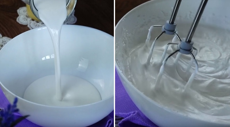 1. W głębokiej misce ubij mikserem lub trzepaczką schłodzoną w lodówce śmietankę na puszystą masę.