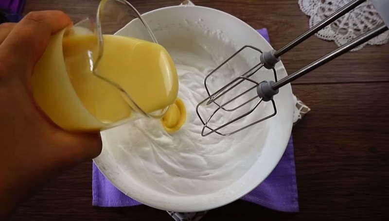 2. Do ubitej śmietanki stopniowo dodawaj mleko skondensowane, ciągle mieszając. Możesz dodać mniej mleczka, jeśli nie chcesz, aby lody były zbyt słodkie.