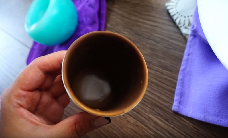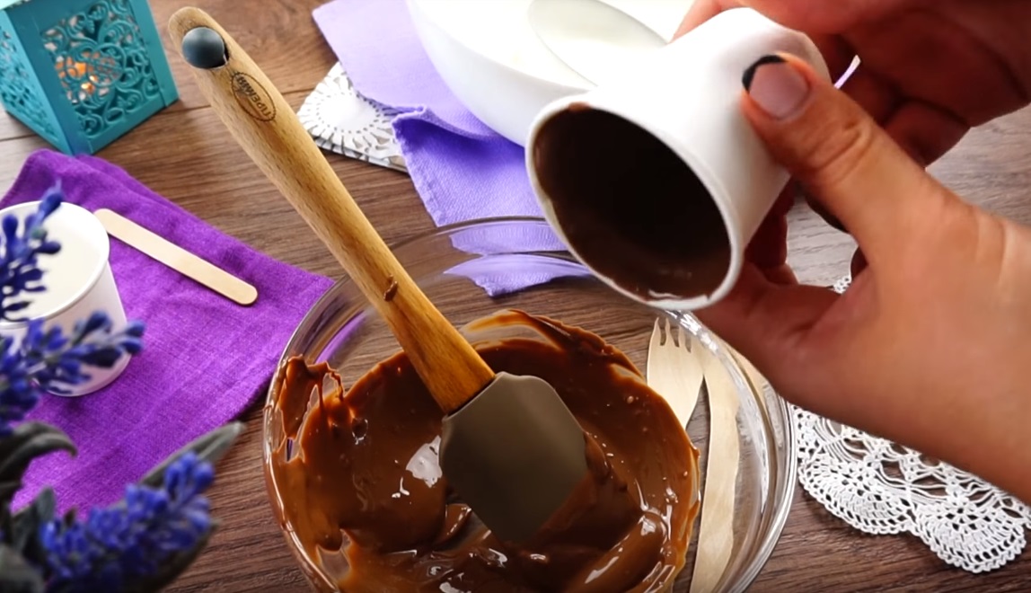 5. Do każdego z kubeczków wlej po trochu rozpuszczonej czekolady tak, aby pokryła ona każdą ze ścianek. Nadmiar czekolady wlej z powrotem do miseczki.