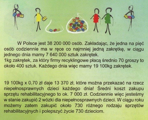 Tym minusem jest cena zakrętek, która wynosi tylko 50 do 70 groszy za KILOGRAM. Dlaczego to tak mało? Na kilogram składa się około 432 sztuki malutkich korków. Nie trudno sobie wyobrazić, jak wielką ilość trzeba nazbierać, aby na przykład sfinansować wózek inwalidzki, którego koszt to mniej więcej 7 tysięcy złotych. Aby Fundacja mogła pomóc wszystkim potrzebującym, którzy się do niej zgłaszają, konieczne jest, aby w akcję zaangażował się każdy Polak. Nie jest to rzecz trudna, zważywszy przede wszystkim na to, że praktycznie każdy z nas ma w ręku minimum jedną zakrętkę dziennie. Jest to mały, niewymagający dodatkowego nakładu pieniężnego gest, który może przyczynić się do wywołania uśmiechu na twarzach wielu osób.