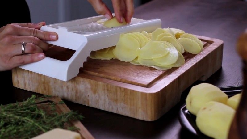 Teraz sedno naszego przepisu: Ziemniaki obierz i dokładnie umyj. Następnie pokrój je w cienkie i równe plasterki. Najlepiej użyj do tego tarki ale jeśli masz wprawę możesz to również zrobić ręcznie.