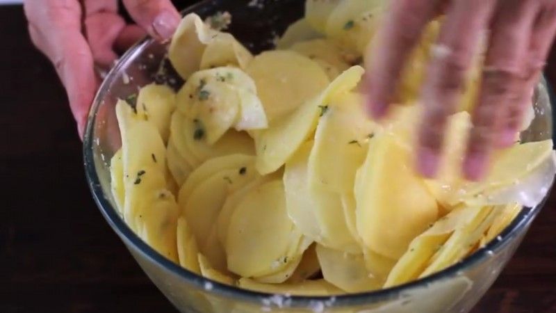 Pokrojone ziemniaki umieść w dużej misce (będzie Ci łatwiej wymieszać), polej roztopionym masłem, posyp przygotowanym parmezanem, dodaj przyprawy i zioła. Wymieszaj wszystko bardzo dokładnie, najlepiej użyć dłoni, wtedy będziesz miał pewność, że każdy plasterek jest obtoczony równomiernie.