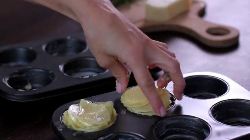Teraz do przygotowanych foremek, nakładaj plasterki ziemniaków. Plasterki układaj płasko, jeden na drugim. Nie musisz tego robić idealnie równo. Ponownie posyp całość pieprzem i tymiankiem i gotowe.