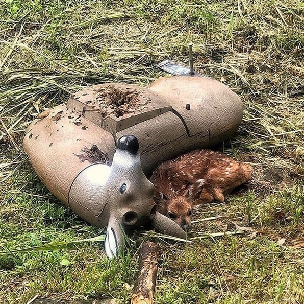 Zwłaszcza, że sztuczny jeleń obok którego położył się maluch to tarcza strzelnicza używana przez myśliwych do trenowania strzelania.